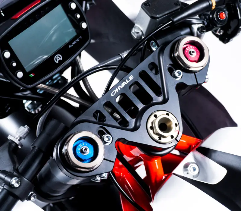 Sospensione anteriore: STANDARD: Forcella upside down con steli da Ø 33mm e piedini CNC. Config. molla K7-K7 e precarico molla regolabile PRO/RACE: Forcella Ohracing con steli da Ø 35mm completamente regolabile. Config. molla K7-K8